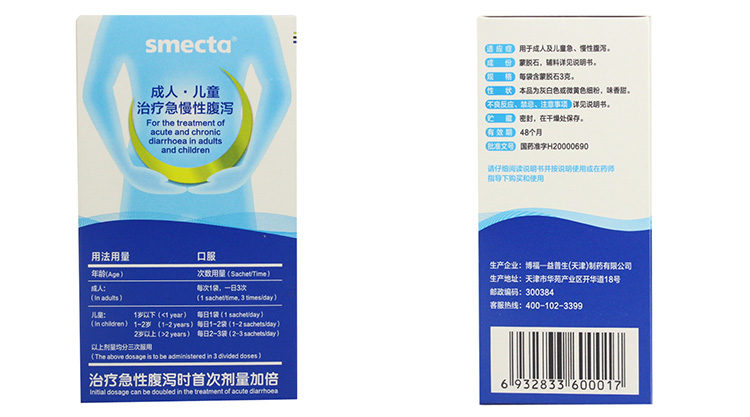 藥理毒理 : 本品為天然蒙脫石微粒粉劑,具有層紋狀結構和非均勻性電荷分布,對消化道內的病毒、病菌及其產生的毒素、氣體等有極強的固定、抑制作用,使其失去致病作用;此外對消化道黏膜還具有很強的覆蓋保護能力,修復、提高黏膜屏障 對攻擊因子的防御功能,具有平衡正常菌群和局部止痛作用。